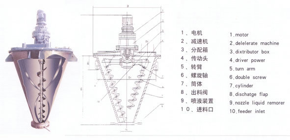 概述 由螺旋的公、自转运动使物料在锥体内产生复合运动,主要产生四种运动形式: (1)螺旋沿壁公转,使物料沿锥壁作圆周运动; (2)螺旋自转使物料自锥底沿螺旋而上升; (3)螺旋的公、自转复合运动使一部分物料被螺旋圆柱面内,同时受螺旋自转的离心力作用使螺旋圆柱面内的一部分物料向锥体径向排放; (4)上升的物料受自身重力作用下降。四种运动在混合机内产生对流、剪切、扩散,从而达到快速均布混合的目的。