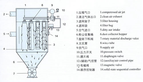 含尘气流从进气口进入下箱体后,部分沉降,轻微粉尘浮动时被滤袋阻留,净化空气透过滤袋,经文氏管进入上箱体,从出气口排出。积附在滤袋外壁的粉尘不断增加,当阻力在限定(一般为80-120毫米水柱)的范围内,就要清除积附在滤袋外壁的粉尘,清灰是由控制仪定期顺序触发各控制阀,开启脉冲阀,使气包内的压缩空气由喷吹管孔喷出(一次风)通过文氏管诱导数倍于一次风的周围空气(二次风)进入滤袋,使滤袋在一瞬间急剧膨胀并伴随着气流的反向作用,被抖落的粉尘落入灰门经排灰阀排出机体。