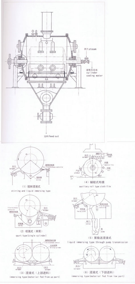 原理 滚筒干燥机是一种内加热传导型转动干燥设备,湿物料在滚筒外获得以导热方式传递的热量,脱除水份,达到所以要求的湿含水含量,热量由筒内壁传到筒外壁,再穿过料膜,其热效率高,可连续操作,故广泛应用于液态物料或带状物料的干燥,对膏状和粘稠物料更适用。