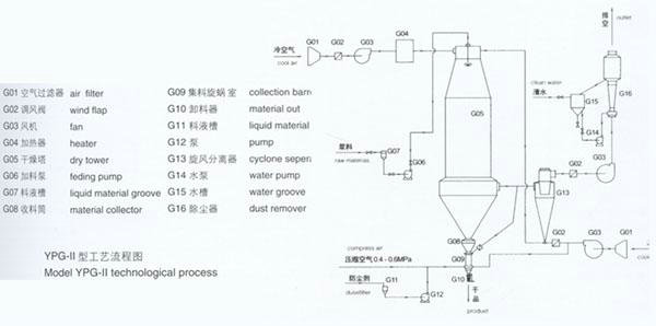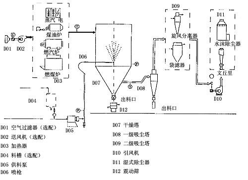 本机组是一种可以同时完成干燥和造粒的装置。按工艺要求可以调节料液泵的压力,流量,喷孔的大小,得到所需的按一定大小比例的球形颗粒。 本机组工作过程为料液通过隔膜泵高压输入,喷出雾状液滴,然后同热空气并流下降,大部分粉粒由塔底排料口收集,废气及其微小粉末经旋风分离器分离,废气由抽风机排出,粉末由设在旋风分离器下端的授粉筒收集,风机出口处还可装备二级除尘装置,回收率在96-98%以上。 本机组与物料接触部分的塔体、管道、分离器的材料,均采用SUS304制作。在塔体内部与外壳之间有足够的保温层,填充材料为超细玻璃棉,塔体设有观察门、视镜、光源及控制仪表,由电气控制操作台控制和显示。 本机组的热源装置采用蒸汽加热或电加热器,具有操作方便、启动快、结构紧凑、热风干净清洁等优点。另外在电气控制柜内装有电加热器的控制调节装置,使进口温度无级调节。对于缺电地区可采用蒸汽加热或燃煤、燃油热风炉等方式,局部或全部代替电加热装置。本厂可提供根据用户的实际需要的各种加热方式。