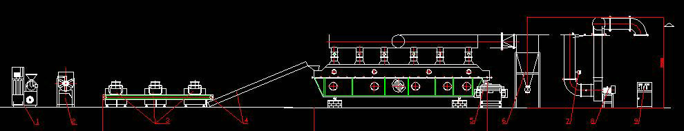 1、鸡精生产线采用整合粉碎、混合、制粒、干燥、冷却、分筛、加香工段的形式,既功能明确,又能有机结合,统筹运转,达到工艺流水作业。 2、鸡精生产线的核心部分:干燥系统。采用分段加热的方式,预干燥段采用高压低风量风机,使较湿的鸡精颗粒能完全流化;干燥段采用低压高风量的风机,单位时间内带走水份多,干燥均匀;冷却段采用高风量风机,能迅速带走热量,降低产品温度,既达到水分控制的要求,又方便后续包装工艺。 3、干燥介质循环系统:鼓风机、加热器、进风管道采用不锈钢制作,避免产品受不洁净风而被污染的可能。 4、干燥主机的上下床体之间采用快开式结构,改变了传统结构采用螺栓固定连接的形式,极大地方便系统彻底清洗。 5、铺料床板的孔型采用组合式结构,前段采用舌形孔,使物料能通畅的往前走动而不产生漏料现象;中后端采用直孔,热风的穿透率更高,干燥过程的热交换更充分。 6、下床体采用不锈钢无缝钢管支撑,床体结构更坚固,使用寿命长。 7、下床体内部采用不锈钢满焊制作,避免洗清时污水进入保温层,从而影响产品品质,并且还设有清理口,方便清洁设备。 8、系统还配备了带吸尘的粉碎机组,高速混合机,物料中转输送机组,分筛加香一体机组等。特步干燥鸡精生产线高效组合,整体美观,性能稳定,被广大业内资深人士认同称颂。