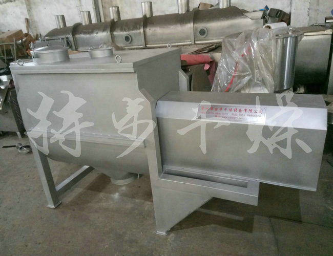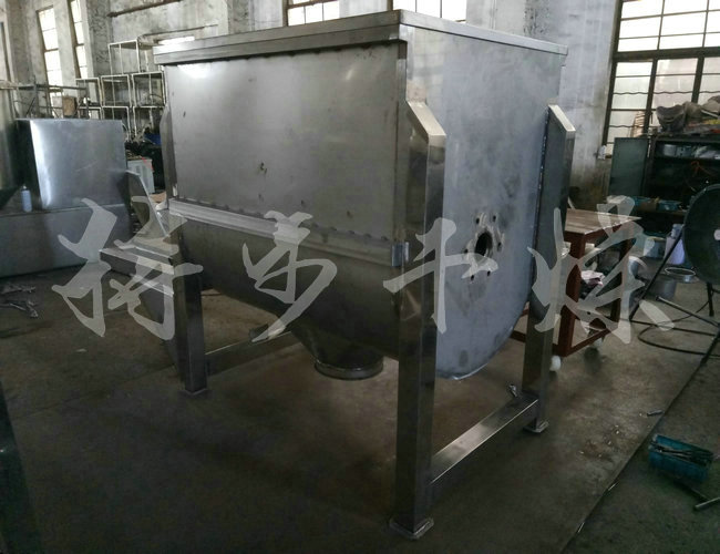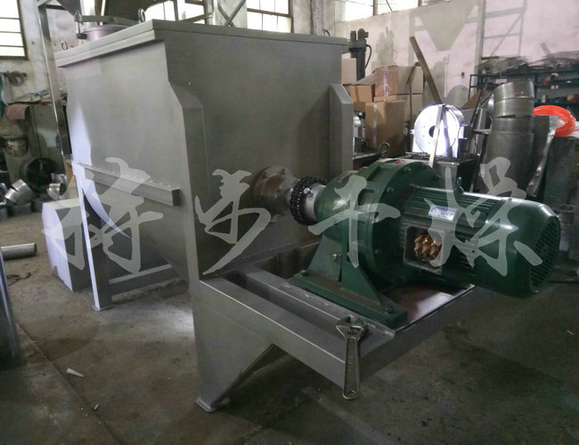 鸡粉生产线专用加香混合机螺带混合机在搅拌轴的螺旋带运动下,使内外螺旋带在较大范围内翻动物料,内螺旋带将物料向西侧运动,外螺旋带将物料两侧向内运动,使物料来回掺混,另部分物料在螺旋带推动下,沿轴向径向运动,从而形成对流循环。物料在较短时间内获得快速均匀混合。